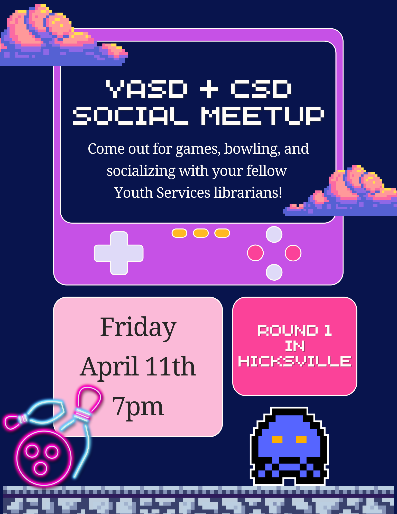 Join YASD and CSD for a Youth Services meet-up at Round One in Hicksville on Friday, April 11th at 7pm!